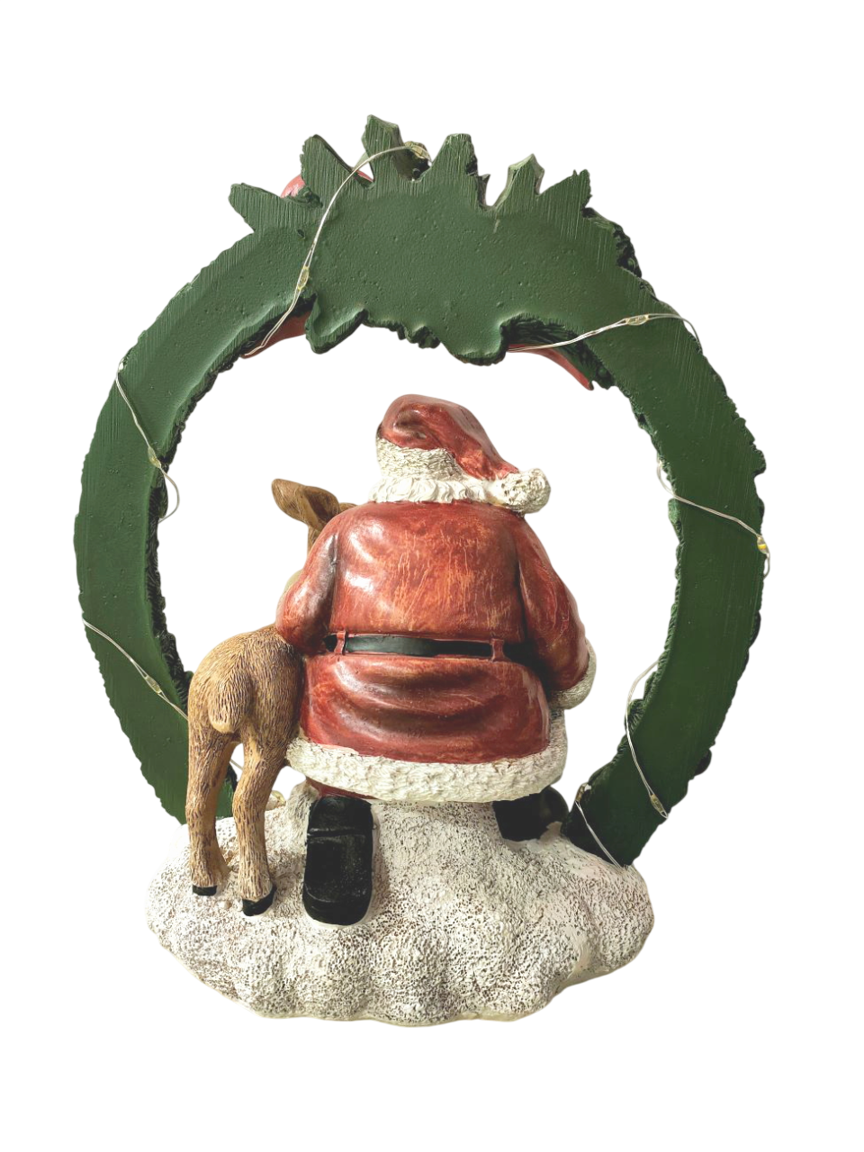 Babbo Natale seduto con ghirlanda e cerbiatto, prodotto in resina e dipinto a mano.
