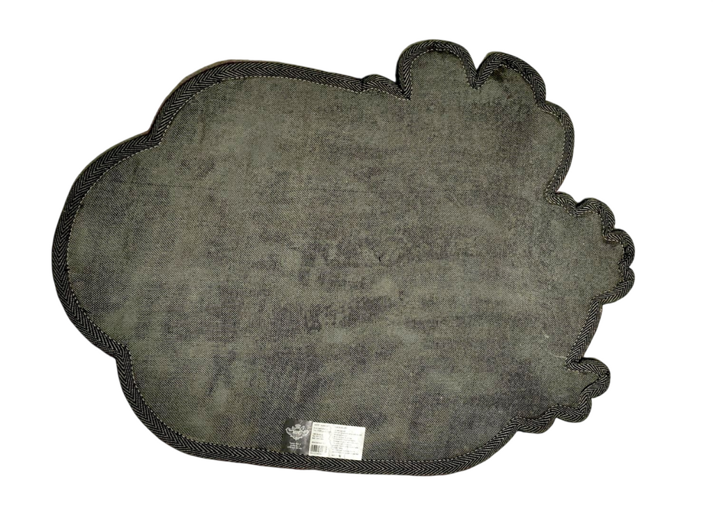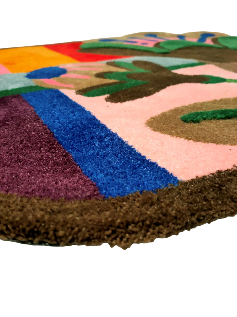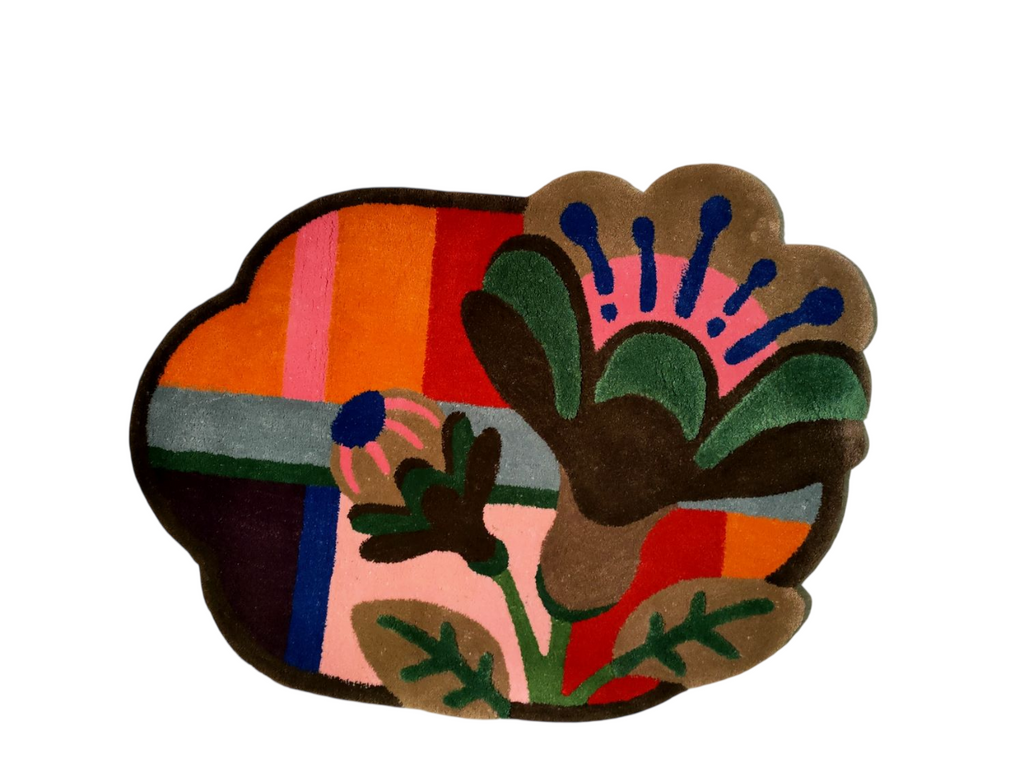 Un tappeto unico nella forma e nei colori, realizzato a mano dall'intreccio di flati in lana acrilica che  ciuffo dopo ciuffo si è giunti a una superficie morbia, compatta e stabile.